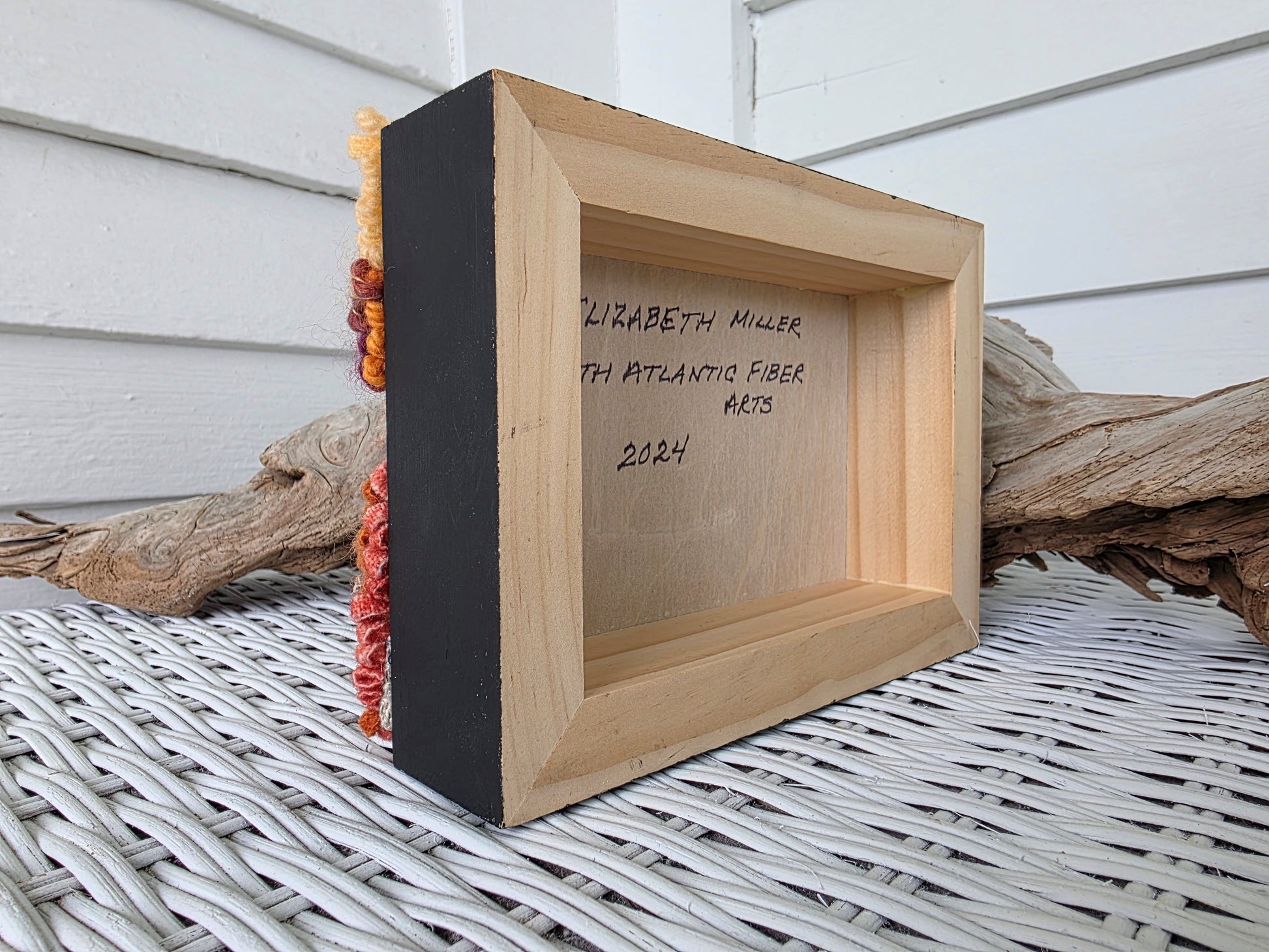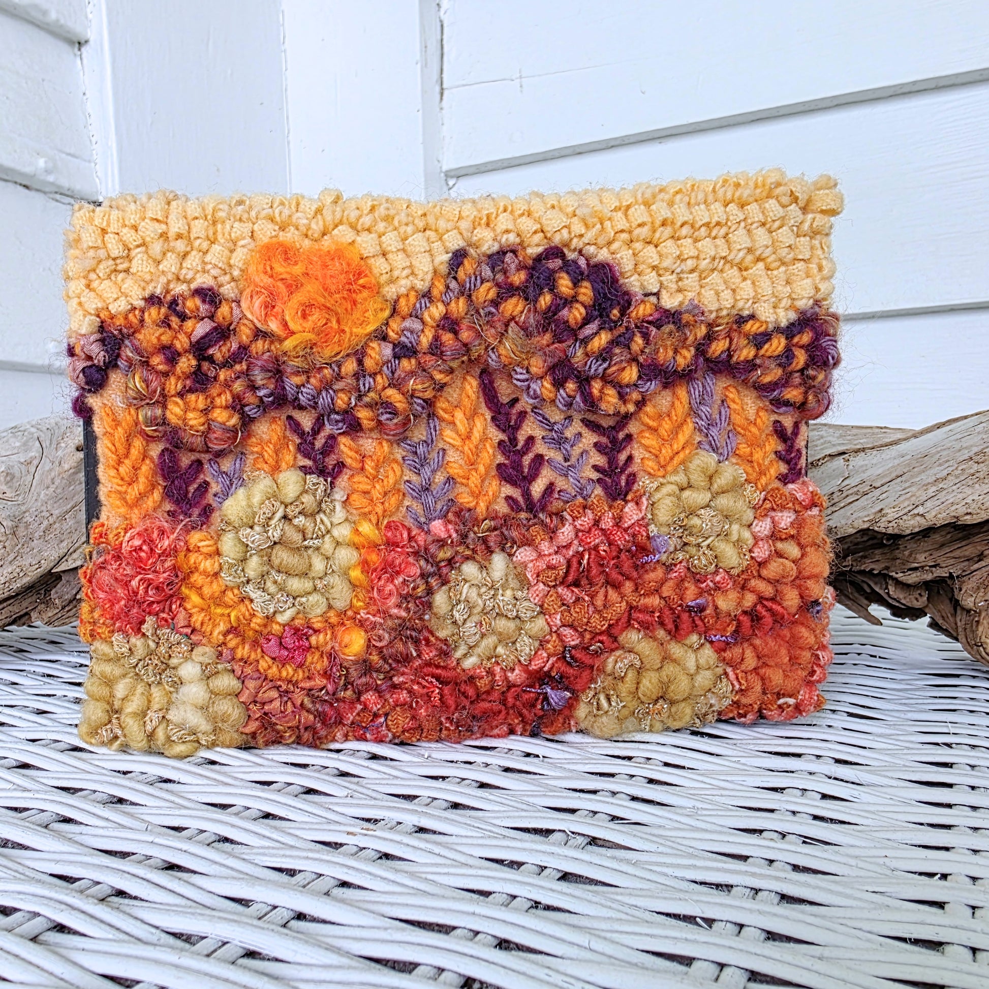 This small 5" x 7" piece is hooked in a variety of fibers including wool strip, silk, yarns, and more. It is an interpretation of a fall sky over a hay field here in Maine.