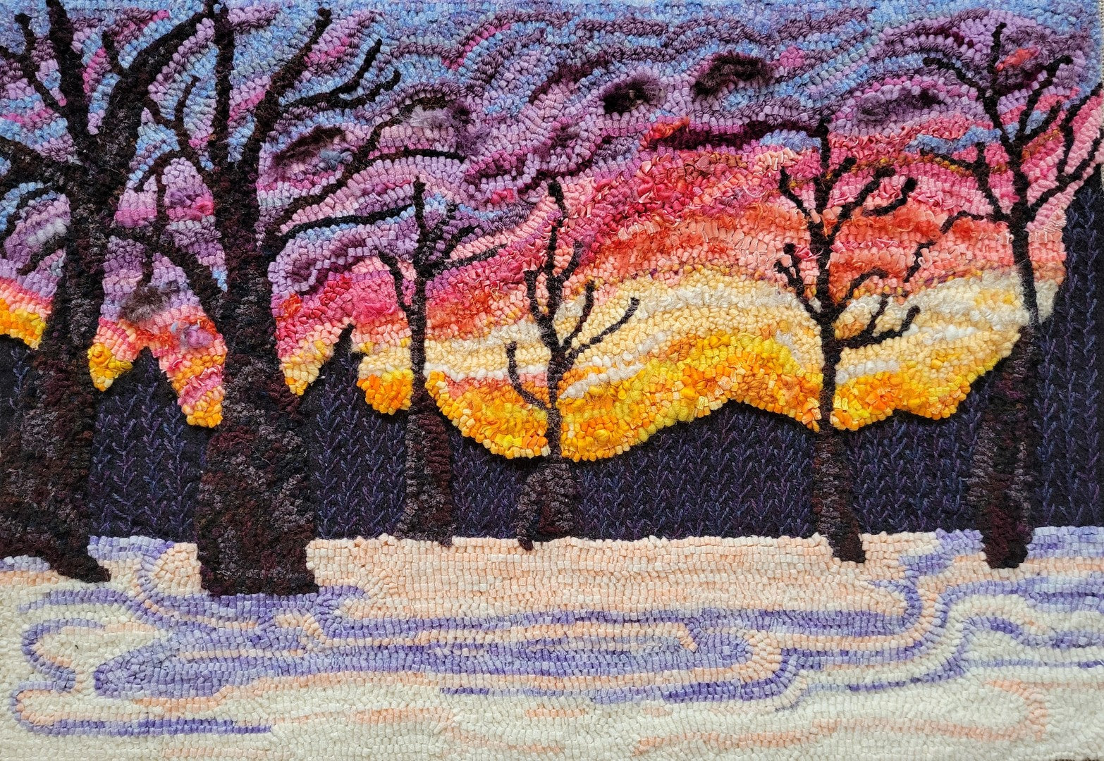 This landscape was inspired by an actual sunset at my home in Paris, Maine. As I was stumbling through the snow to go feed my chickens, I was stopped in my tracks by a sky afire. This is my interpretation of that moment.