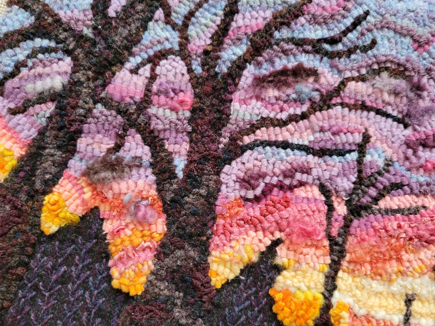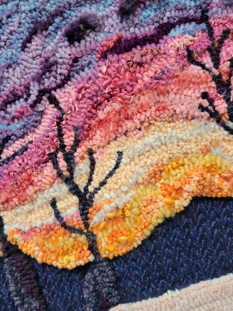 Wool strip, yarns, silk, and more on linen foundation with wool applique and fly stitching on the distant treeline.