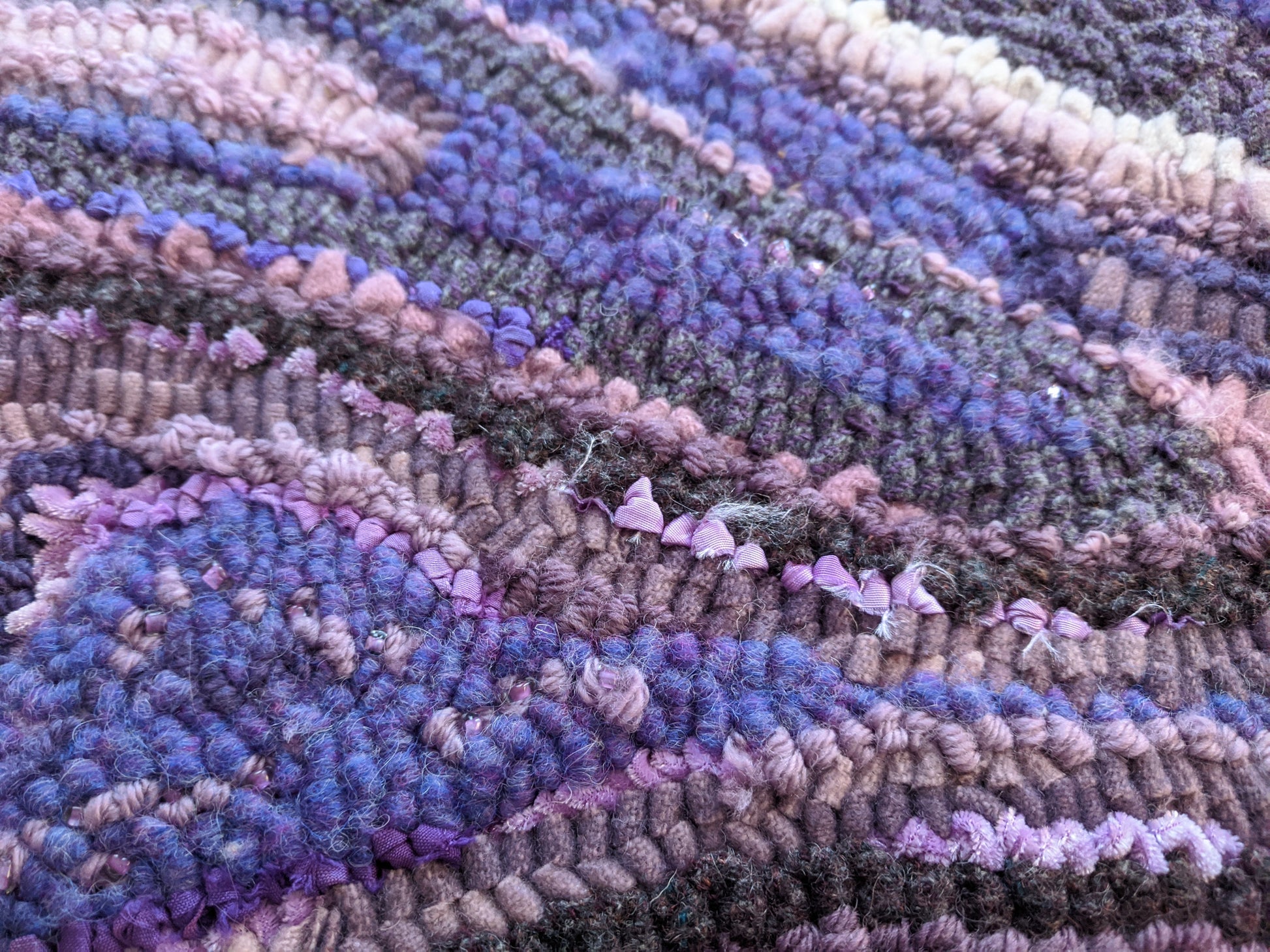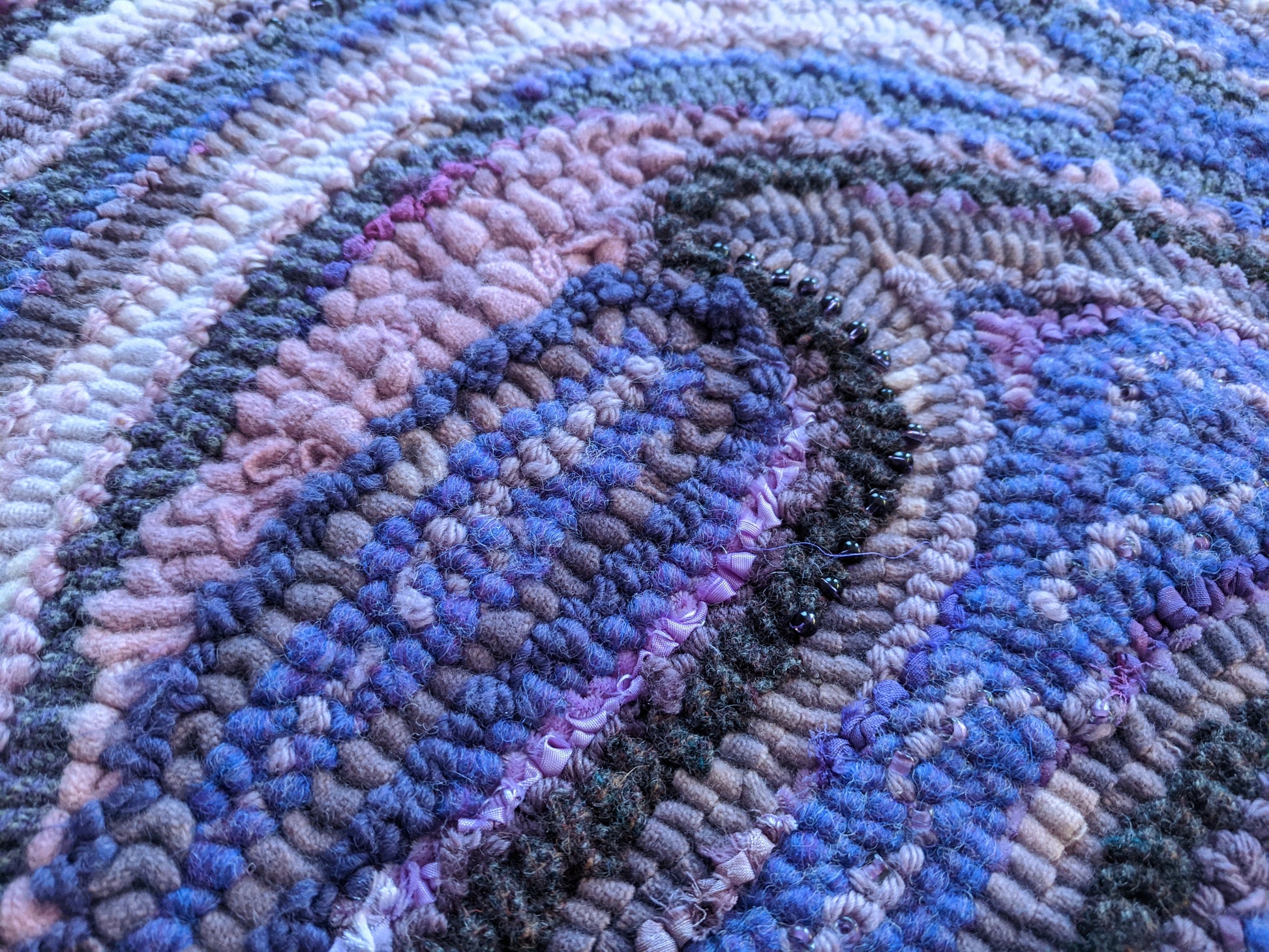 Mostly wool strip hooked on linen foundation, hand hooked, loop by loop. Much of the material is hand dyed by me, specifically for this rug. Other materials used are silk, velvet, taffeta, beads, shells, and semi precious gemstones.